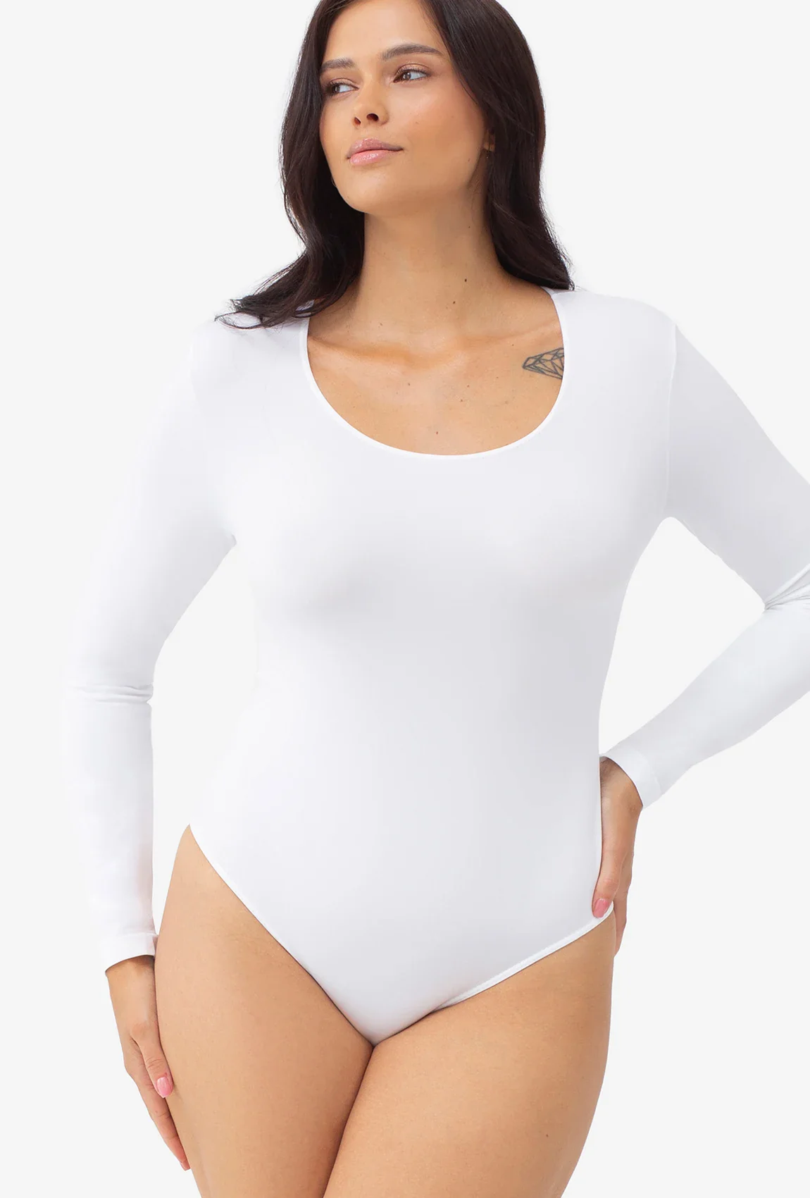 Długi rękaw sprawia, że body wygląda jak elegancka bluzka, a bezszwowa technologia gwarantuje brak widocznych przeszyć i otarć. Dolna część w formie klasycznych fig zapewnia komfort noszenia przez cały dzień. Całość idealnie opina ciało, podkreślając kobiecą sylwetkę w subtelny i zmysłowy sposób.